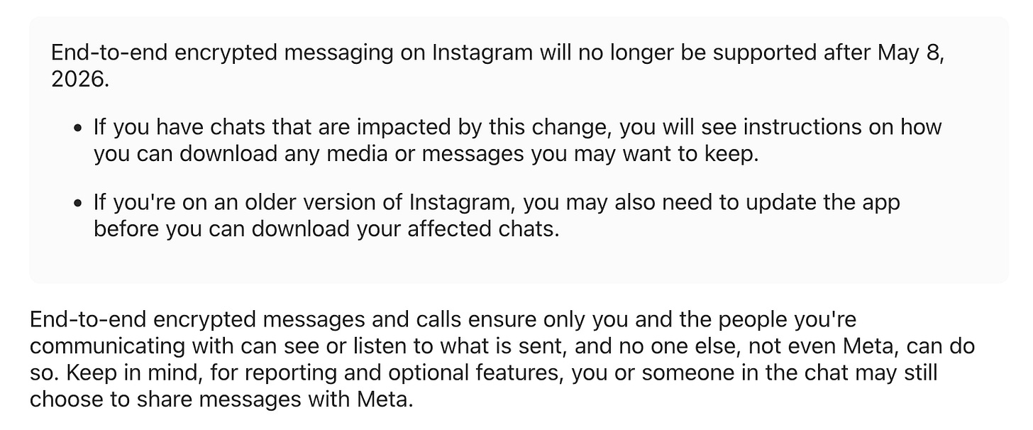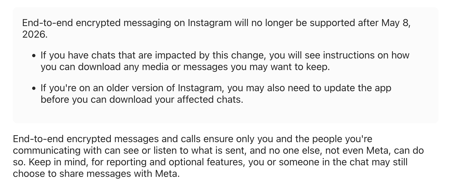 March 2026: Meta announces that end to end encrypted DMs on Instagram will no longer be supported come May 8th. End to end encryption, or E2EE, just means that the sender and recipient can read the messages, but not Meta.